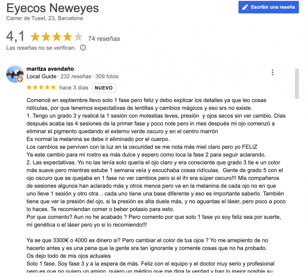 En Eyecos, nos complace la excelencia en el cuidado ocular y la satisfacción de nuestros pacientes. Compartimos las reseñas positivas de Google. Gracias por confiar en la Clínica Eyecos – Cambio de color de ojos.